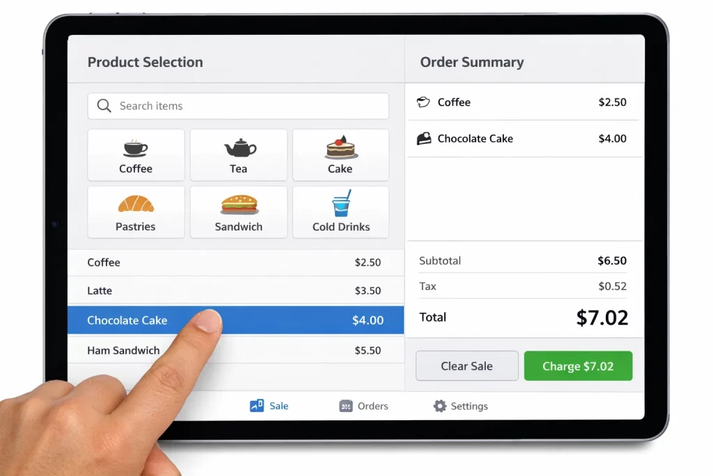 2.商品の選択: 表示された商品一覧から、お客様が購入する商品をタップします。数量を変更する場合は、商品名を再度タップするか、数量入力ボタンで調整します。