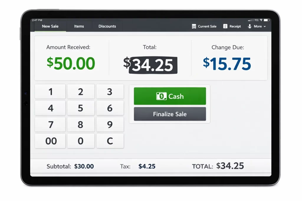3.現金の場合: お客様から受け取った金額を入力すると、自動でお釣りが表示されます。これはまるで「優秀な暗算家」が瞬時に計算してくれるようです。