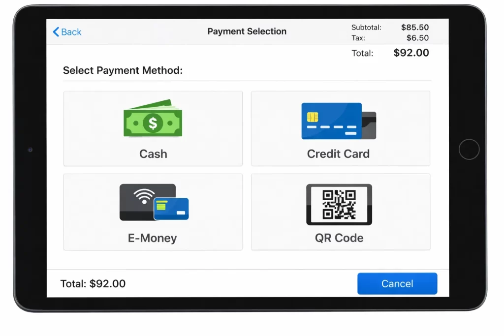 2.支払い方法の選択: 「現金」「クレジットカード」「電子マネー」「QRコード決済」など、お客様の希望する支払い方法をタップします。